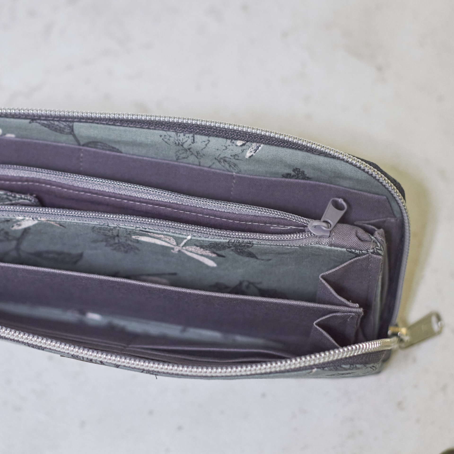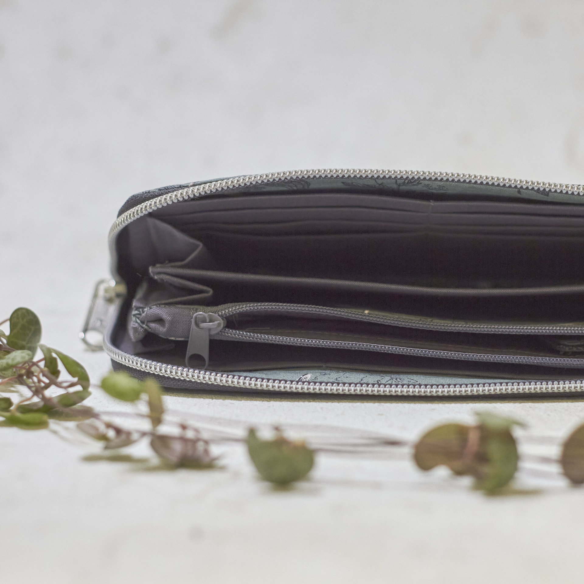 Geöffnet wird das Portemonnaie mit einem robusten Reißverschluss. Innen befinden sich 9 Kartenfächer, die mehrfach bestückt werden können. Hinter einem Steckplatz der Karten können deine Geldscheine sicher aufbewahrt werden. In der Mitte befindet sich dann ein großes Münzfach.